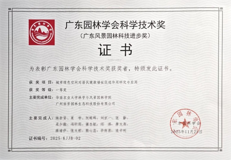 近日,广东园林学会追究公布2025年度科学技能奖获奖名单。丽芳园林凭借其在绿色空间健康效益接头与欺骗方面的凸起篡改限度,荣获一等奖。