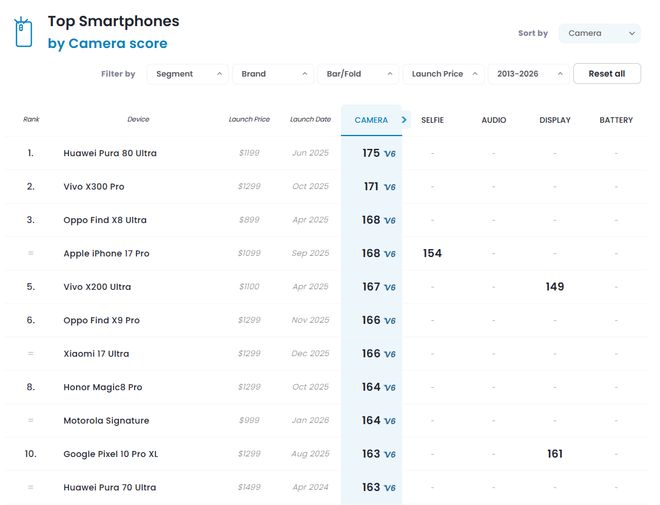在 DXOMARK 影像第六版基准测试中,小米 17 Ultra 得回 166 分,在众人影像名次榜中位列第 6,与 OPPO Find X9 Pro 比肩,获 DXOMARK 相机金标(>160 分)认证。